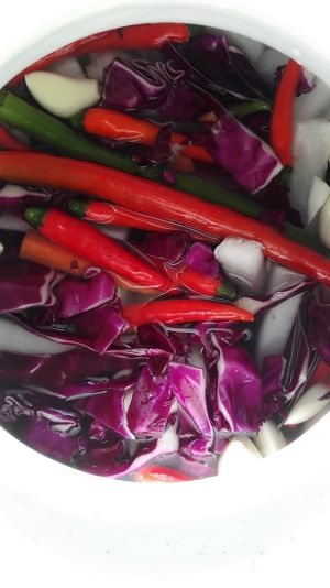 1.热水大半瓶加百分之三十的盐晾凉。 2.加入花椒,一勺,大料一颗。 3.放入洗好晾干的蔬菜,姜蒜多放杀菌提味 4.辣椒根据自己口味放,小米辣我放了六根 5.收口时在瓶口放两勺盐,放入冷藏大概一周到十天就可以吃了。