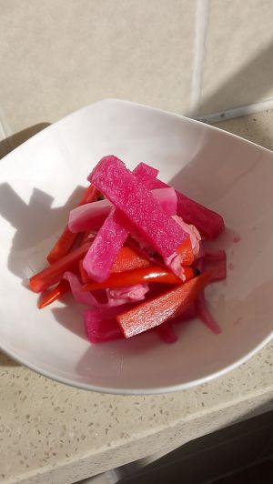 这是腌好的泡菜,红色是心里美红心萝卜泡出来的红色。