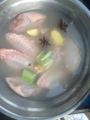 鸡翅洗净。 放入葱姜 花椒 料酒 煮10分钟。目的除脏 惺。 后清水洗干净