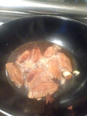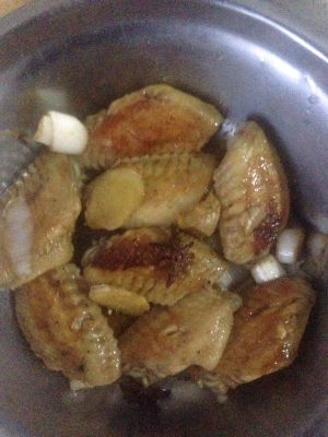 加少许油,将葱姜蒜暴香,加入鸡翅,加入老抽,将鸡翅煎到两年金黄,大火盖住