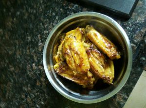 将腌好的鸡翅,用小火煎至两面金黄(注意翻动,要不就糊了)
