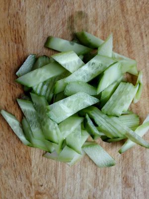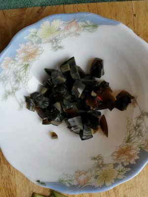 切吧切吧,都切了吧。黄瓜不要切的太薄,稍微厚点,皮蛋么就切成小块啦!