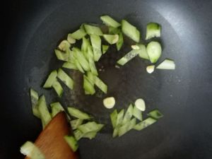 锅里下油,倒入黄瓜翻炒片刻,倒入料酒、糖继续翻炒。
