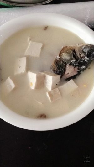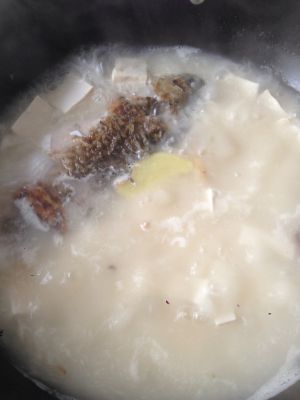 煮沸至汤色变乳白加入盐等调料,可以按自己喜好添加,再将胡萝卜,芹菜,蒜及白豆腐倒入锅中。。起锅即可!