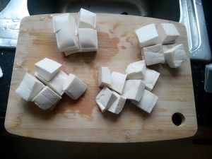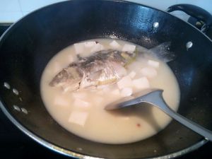 豆腐切块,开水煮一下去豆腥味。放入煮成奶白的鱼汤里,继续煮开。