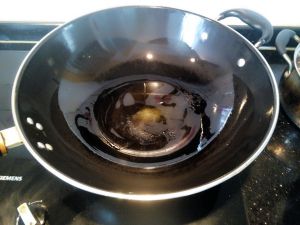 花生油加热放适量盐加入小鱼仔稍煎片刻/,加姜丝,待小鱼变色加水淹过