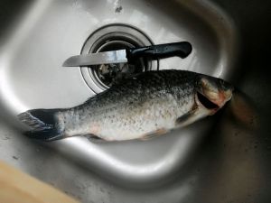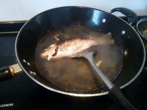 煎好后,直接倒入开水,没过差不多鱼身位置,加少许料酒,胡椒粉干辣椒,中火慢炖,汤汁发白
