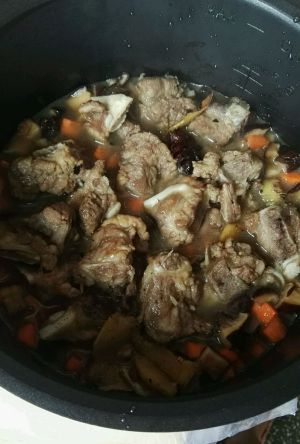 炖锅内加水,放入姜片和排骨,炖约1小时