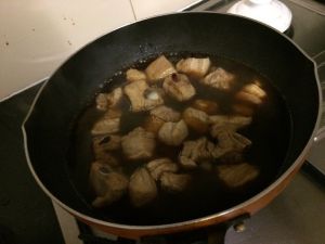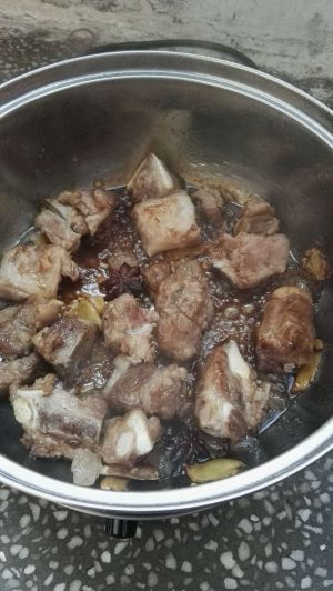 锅中加入花生油,油热后加入姜片,八角爆炒,炒出香味后加入排骨,翻炒几次后加入一勺酱油,半勺老抽,翻炒排骨着色后加入热水,刚好没过排骨,再加入少许料酒,盐调味,煮沸后备用
