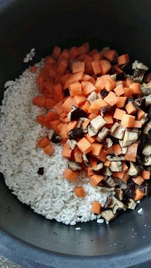 按照东北大米:糯米2:1的比例洗好米,加入切成丁的胡萝卜丁和香菇丁,一起倒入电饭锅中