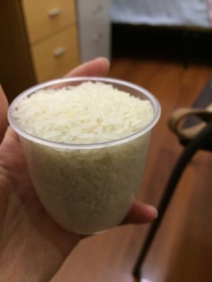 煮肉排时准备米。我用煮干饭的“茉莉香米”,洗过后放电饭锅中。