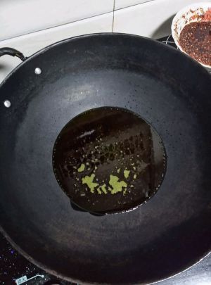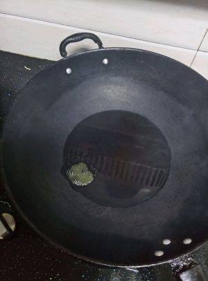 锅中适量油烧至7成热,放入葱花,蒜瓣和姜丝爆出香味儿。