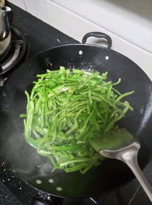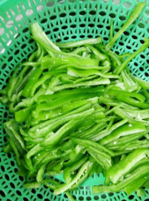 把青椒切丝,先炒七成熟,盛入盘中备用