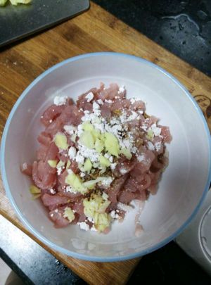 当肉丝吸饱水份后,加入干淀粉,继续抓匀。