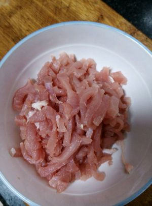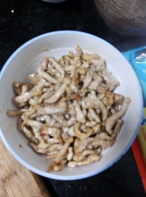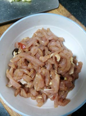 在猪里脊肉丝中加入少许盐,鸡精,料酒,味极鲜酱油抓匀,腌制15分钟。