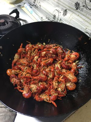 炒到小龙虾变色卷曲后倒入热水,不用太多水和龙虾齐平就可以了,到时候煮了龙虾还会出水的。水开后看看有没有盐味没有就在放点盐,因为各家的辣椒酱和酱油不同含盐量也不同,所以要不要加盐要自己看。