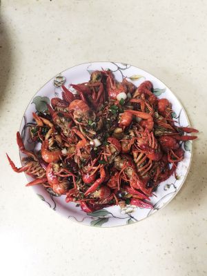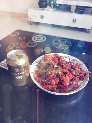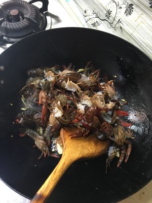 材料翻炒出香味,放龙虾翻炒。放酱油五香粉翻炒均匀。放啤酒大半莫过龙虾的程度,加些许凉白开至完全莫过龙虾。加盖焖煮。