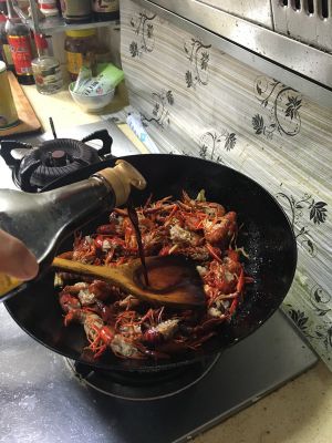 倒入小龙虾翻炒均匀。放料酒,老抽,生抽。