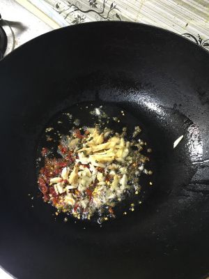 锅烧热放多点油,放入姜蒜花椒干辣椒香料炒香,在放入辣椒酱炒出红油。