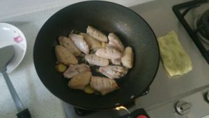 如果是不粘锅,可以不放油,我家是不锈钢锅,所以放了部分油,把鸡翅有毛孔的一面先煎,煎到微微发黄