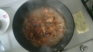 翅根皮焦黄后,加入适量可乐,一瓶的五分之一,再加入少量酱油,大火烧开后小火炖