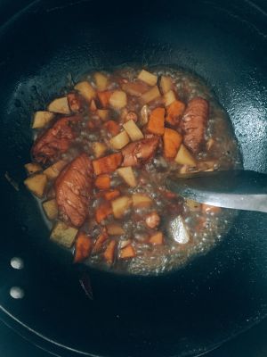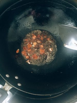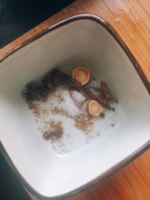加入葱姜蒜片、香料和盐糖,小火炒一下再加入少量酱油和水