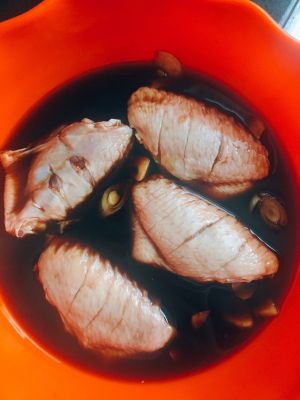 鸡翅洗净后正反各切三刀,放入料酒和酱油中腌着,家里没有料酒了,我用的葡萄酒,也是可以的。加入葱片姜片蒜片腌制约二三十分钟即可