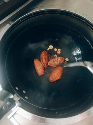 倒入适量花生油,中火,再加入葱蒜爆锅,再加入腌制好的鸡翅,稍微煎一下煎出图片色,然后捞出