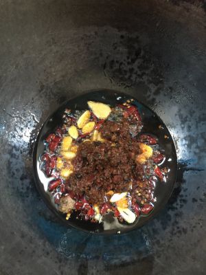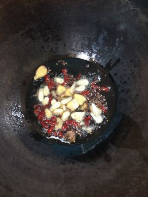 锅中烧热倒入适量的油,加入生姜,花椒,辣椒,蒜瓣炒香