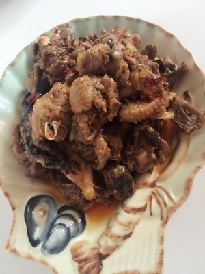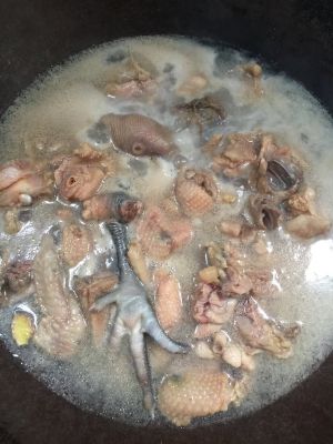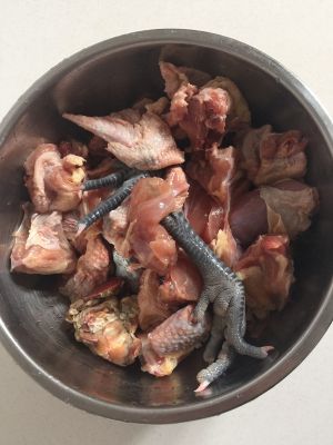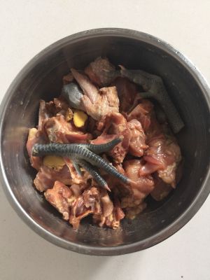 鸡腿斩件,去冷水用一个小葱结,两三个姜片和一瓶盖料酒飞水,撇去浮沫捞出,留汤。