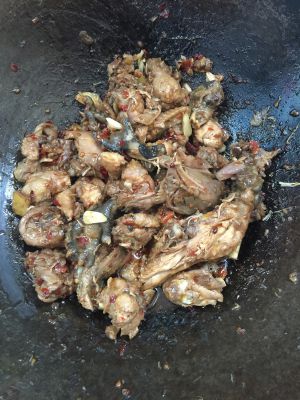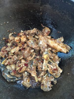 锅中放菜籽油,中火下入鸡块和葱姜蒜同炒,放一小勺盐,炒至鸡块收干,盛出备用