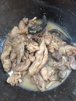 底油炒香葱姜蒜,放鸡块炒变色。把炒过的鸡肉放入高压锅内