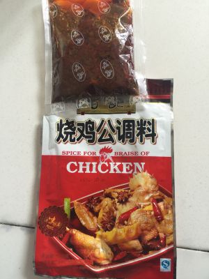 再倒入菜籽油,中火把一勺郫县豆瓣酱炒出红油,加入火锅底料炒香,倒入鸡块翻炒均匀,加入生抽一瓶盖,两茶勺盐,料酒半瓶盖,糖,鸡精,炒好的花椒麻椒和辣椒,八角,再次翻炒均匀。