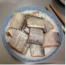 处理好的带鱼切段,用葱姜和料酒腌制15分钟左右