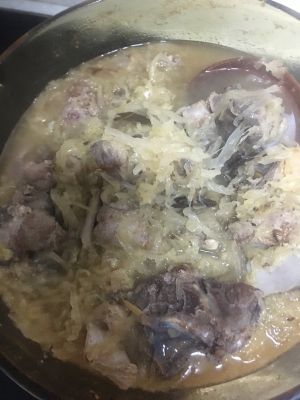 酸菜翻炒至稍干,加水或高汤,下入排骨,加入适量的盐和十三香,大火烧开,转中小火炖2小时