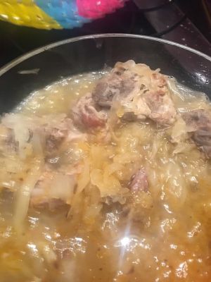 1排骨五花肉洗净冷水下锅, 放一个大料 和料酒,开锅撇血沫子,然后倒出冲洗干净。 2酸菜切丝 可以细些备用。 3炖锅一个,少油,放入肉类翻炒到微黄,加入酸菜翻炒酸菜都裹上油汁,加入温水没过菜品就好,加入蚝油 十三香姜适量盐,小火慢炖50分钟。
