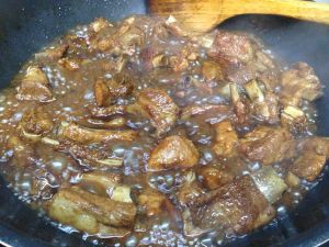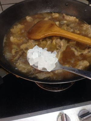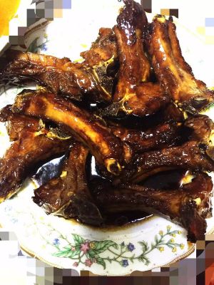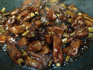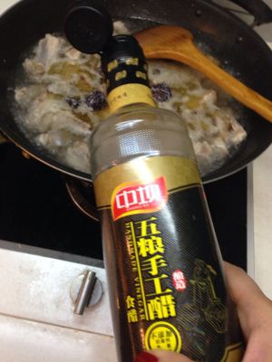 锅内放油少许,放入白糖。变色后放入煮好的排骨,两面都煎黄时,放少许醋。加入煮肉时的汤,收汁后可出锅。
