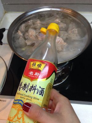 水开后加入老姜、料酒和排骨一起,撩去浮血和腥味,约5分钟后捞出待用