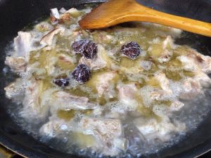 炒锅内倒入菜油,油热后倒入排骨快速翻炒。变色后加入开水、话梅熬煮约5分钟