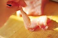 将买来的猪里脊先用水冲洗 切掉两边肥肉的地方 只留瘦肉 然后顺式切成薄片 切好后放入干净的器皿冲洗几遍后 待用
