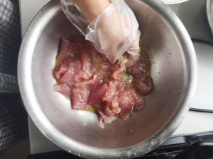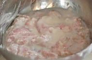 将盛有肉片的器皿水尽量控干 倒入适量料酒不用太多 然后加入2勺精盐一小勺白胡椒粉一小勺味精一个鸡蛋适量淀粉 搅拌均匀 为增加肉的粘稠度 再加些面粉 拌匀