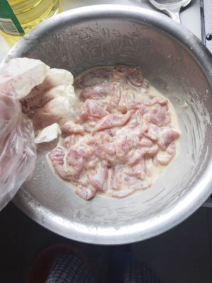 所有材料切好备用,肉切大片放一点料酒胡椒粉去腥腌制十来分,然后开始调淀粉糊,我用的土豆淀粉三大勺加了大约2g的小苏打粉,放适量水一点点加不要加多,淋起淀粉糊看起来像酸奶一样不断流,加苏打是为了炸出来的肉更酥脆。