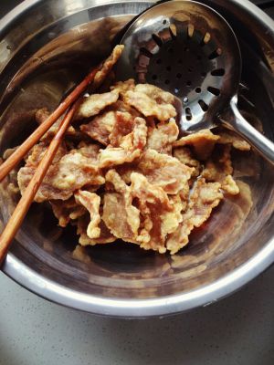 分批放入锅中 防止肉粘连 用手将肉片铺平放入锅中 可用筷子 全部炸好后 再放入油中一起翻炒 使肉更佳酥脆 捞出 放在碗中备用