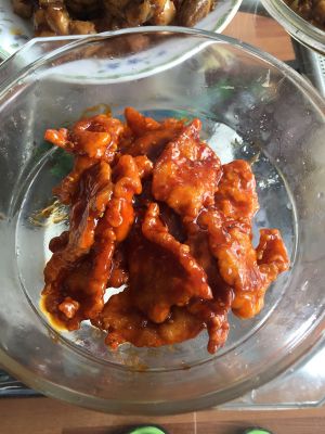 分次把肉炸好第一遍后油温继续加热至最高,油面完全平静,有少许烟冒起,将肉分次下入复炸,炸至有斑驳的焦红色捞出控油。(20秒左右)