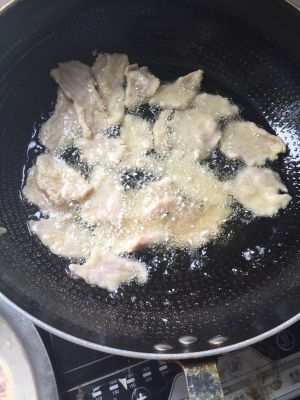 然后就是炸肉片啦,把肉搅拌好,小奶锅里倒油可以多一点,烧热后拿木头筷子试一下油温,筷子周围冒小泡就可以下肉了,把每片肉都充分沾好淀粉糊,下锅时尽量展开肉片,这个图是炸第一遍的,稍微变白即可捞出,因为要想酥脆就要炸二遍。