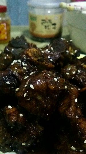 临出锅之前再加点醋,家里有白芝麻的加点白芝麻,我家没有了,我就没加。酸甜微咸的糖醋排骨就做好了。
