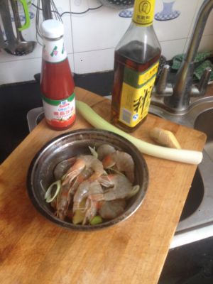 留底油下多一点花椒爆香,下姜蒜爆香,下虾翻炒,翻炒几下下耗油生抽,最后下韭菜小葱节。