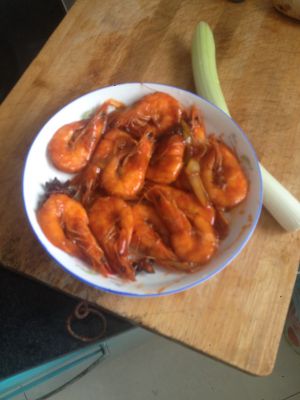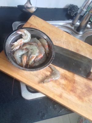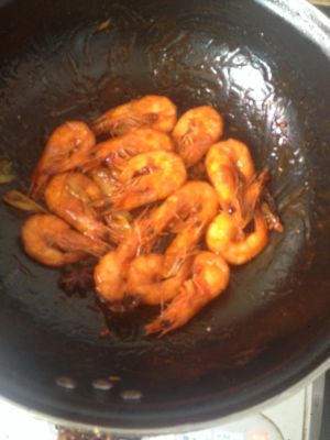 热油,放入蒜爆香,放入大虾,大火快速翻炒,至表面金黄色(外表有一点点酥皮)