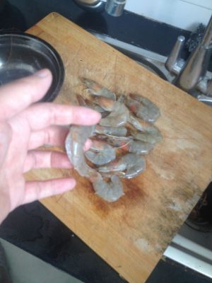 大虾洗净,沿着第二节用牙签挑虾线,用料酒腌制15分钟