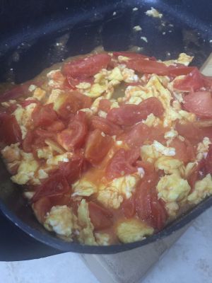 锅里加油烧到8分热,加入打散的鸡蛋,快速翻炒。成型后关火,倒入盘子。